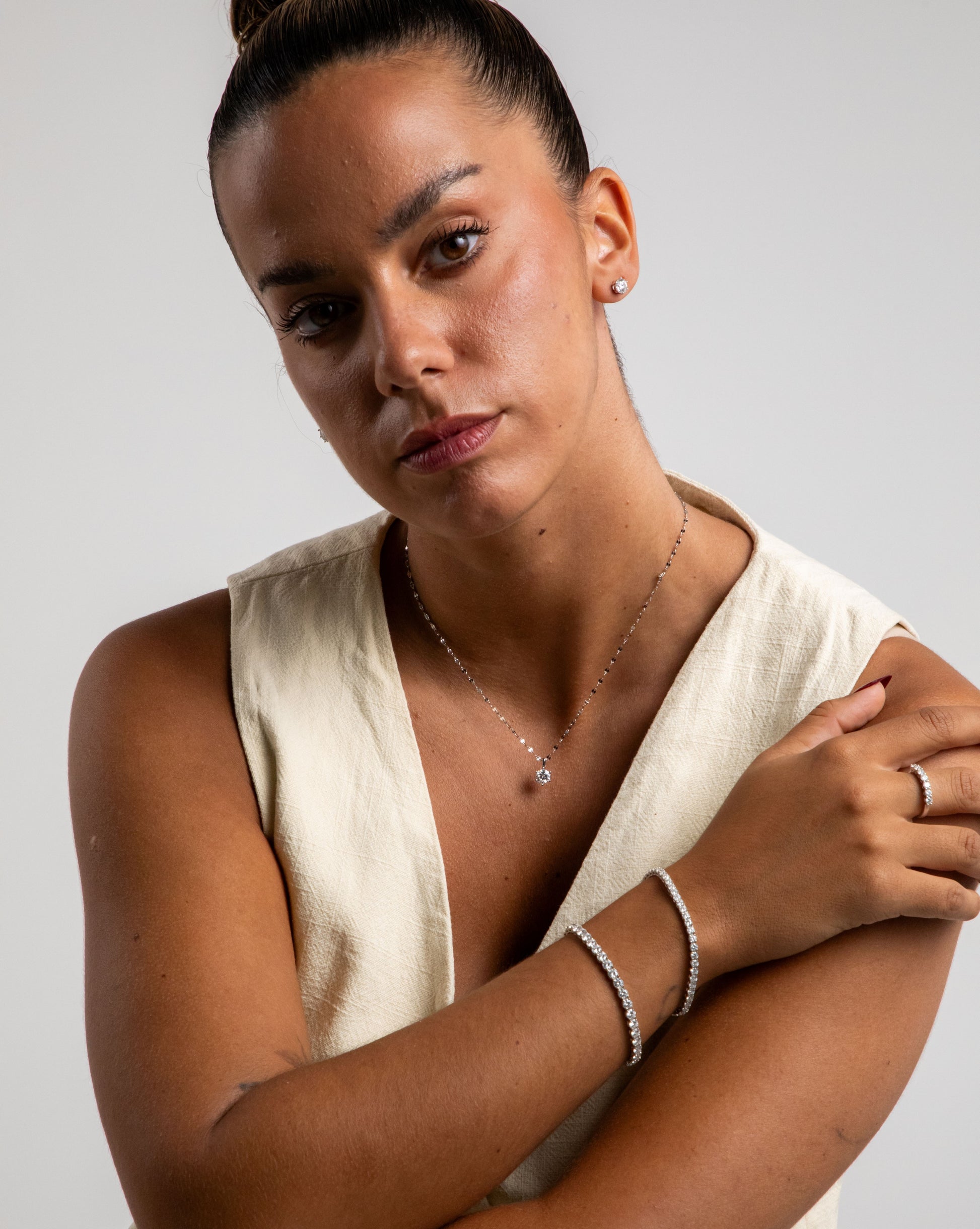The necklace’s minimalist chain frames a single round-cut moissanite, showcasing its natural sparkle. The versatile stud earrings — available in multiple sizes — deliver everyday polish with diamond-like fire. Completing the set, the seven round-cut stones of the band form a striking row of radiance, balancing sophistication with statement appeal.